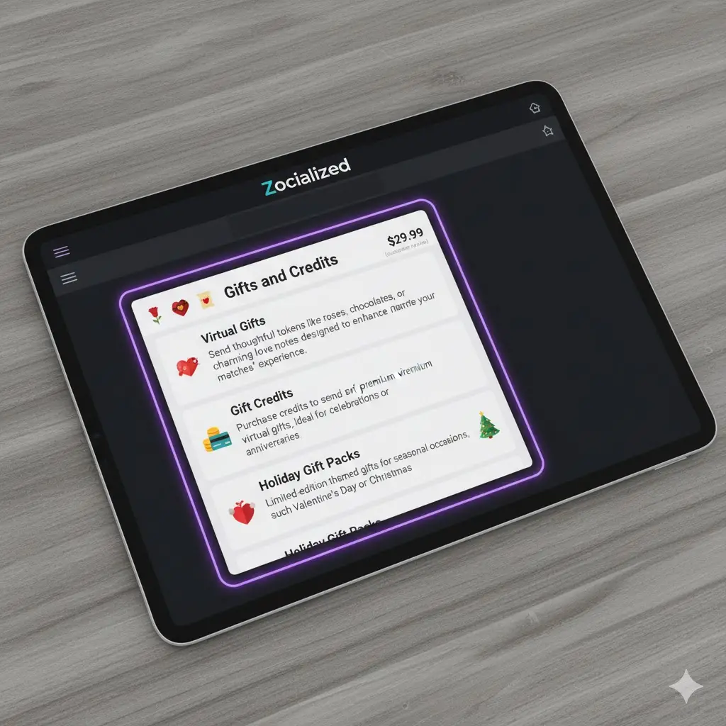 Virtual Gifts: Send thoughtful tokens like roses, chocolates, or charming love notes designed to enhance your matches’ experience. Gift Credits: Purchase credits to send an array of premium virtual gifts, ideal for celebrations or anniversaries. Holiday Gift Packs: Limited-edition themed gifts for seasonal occasions, such as Valentine’s Day or Christmas.