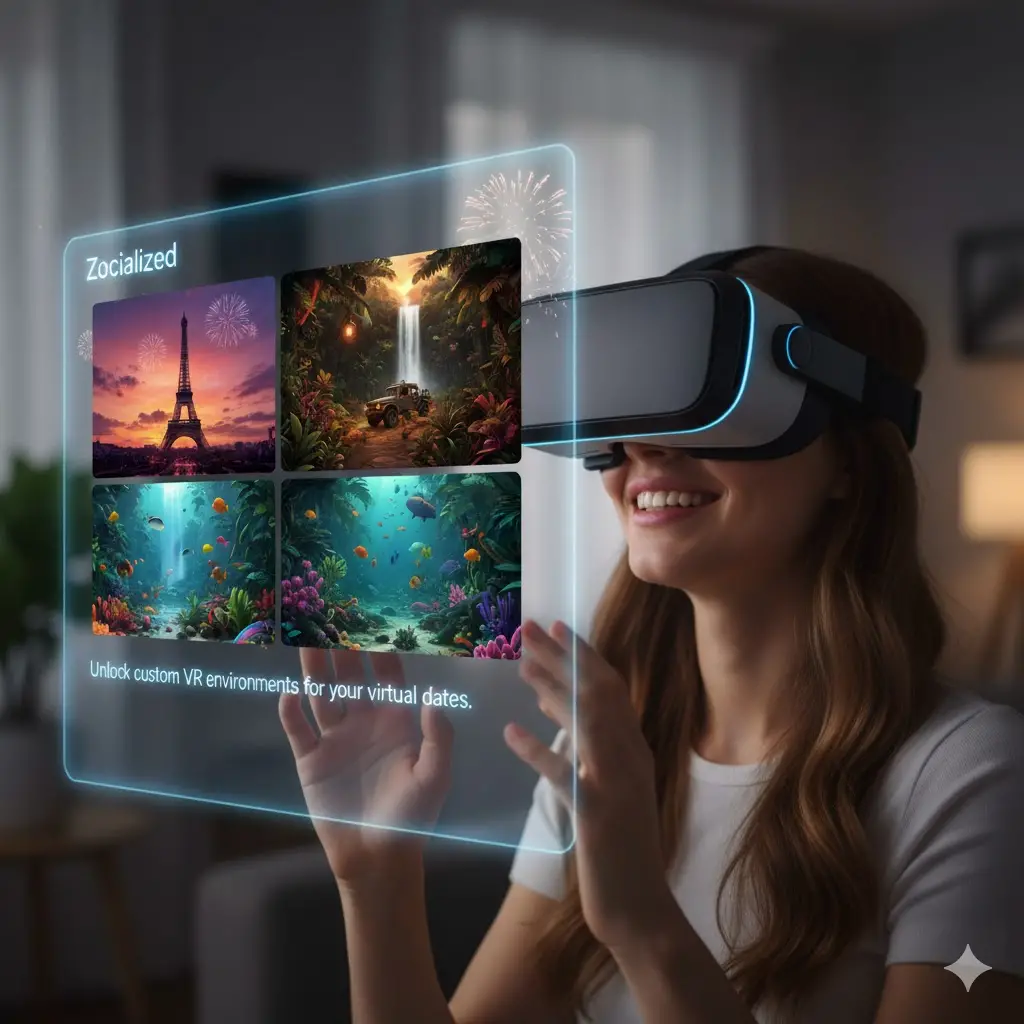 Unlock custom VR environments for your virtual dates, ranging from romantic Parisian sunsets to adventurous jungle safaris. Themes come with interactive elements like animated fireworks or mood lighting.